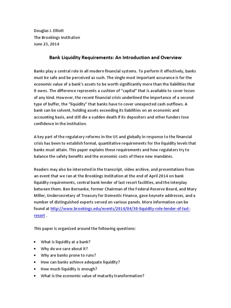 First, with banks required to hold their best quality liquid assets to meet the LCR requirement, they may These requirements are being introduced as micro-prudential measures, intended to improve banks' resilience to liquidity shocks by reducing the maturity mismatch between assets and liabilities. Requirements for banks in Singapore on minimum liquid assets (MLA) and liquidity coverage ratio (LCR). Requirements for domestic systemically important banks (D-SIBs) and internationally active banks to disclose information about their net stable funding ratio (NSFR). • Liquidity regulations reduce investment because banks make less loans and hold more cash and Treasuries. • Require to hoard liquidity during panics • During panic liquidity is scarce => banks less likely to lend liquidity because of liquidity requirement => making liquidity even more scarce.
