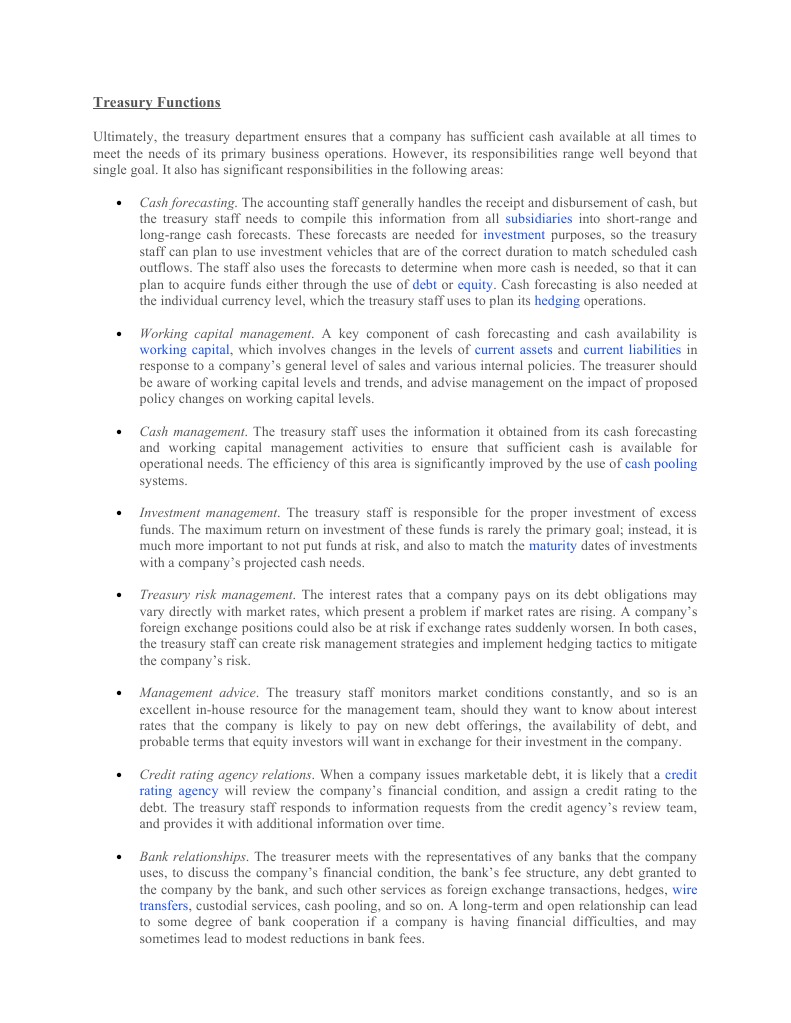 The role of the treasury function in multinationals. Treasury management has become a specialized function and in today's context, treasuries are expected to perform many critical functions. A government department related to finance and taxation, a finance ministry.
