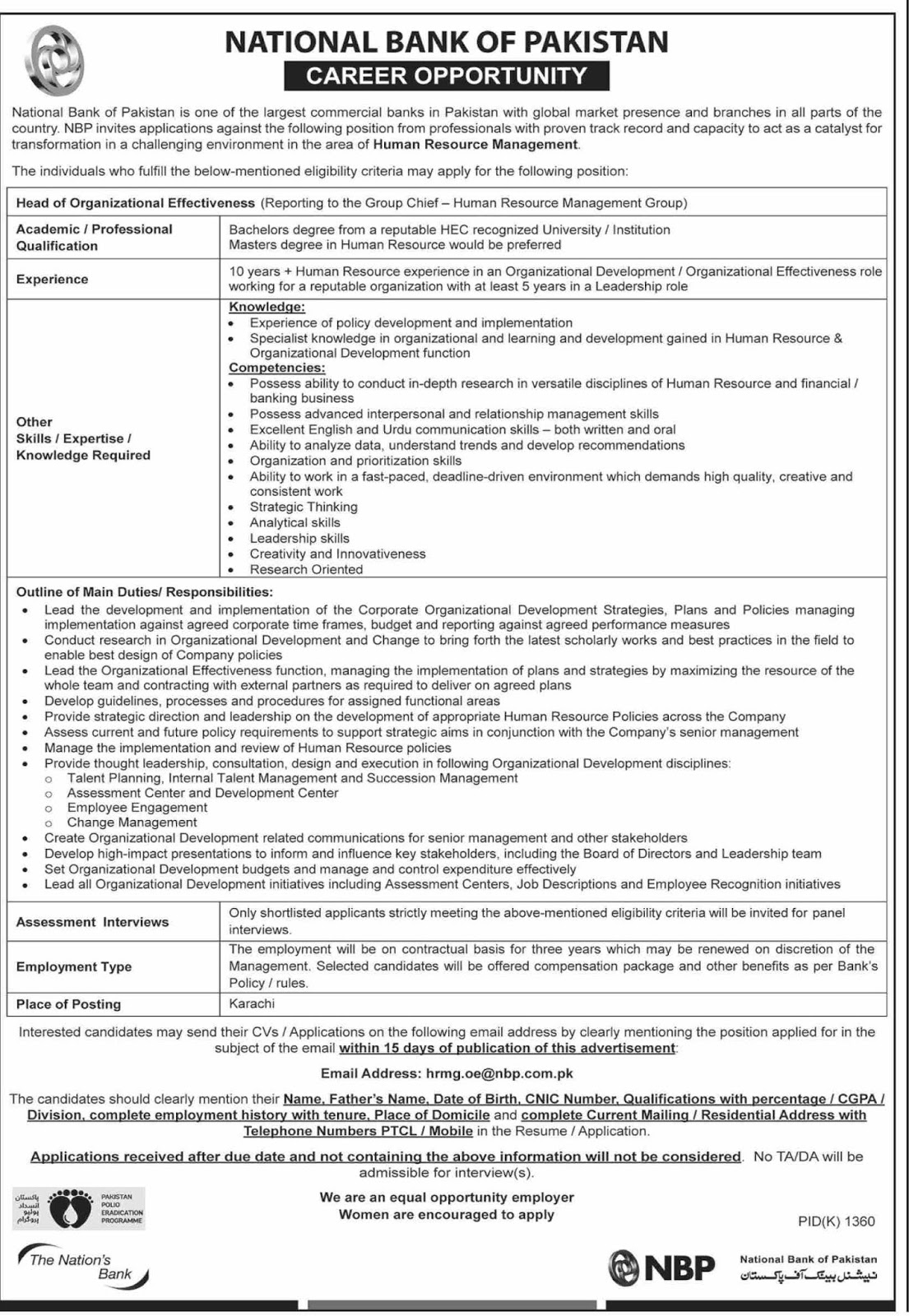 National Bank of Pakistan (NBP) Jobs 2020 for Group Head Corporate Operations at Karachi Apply ...