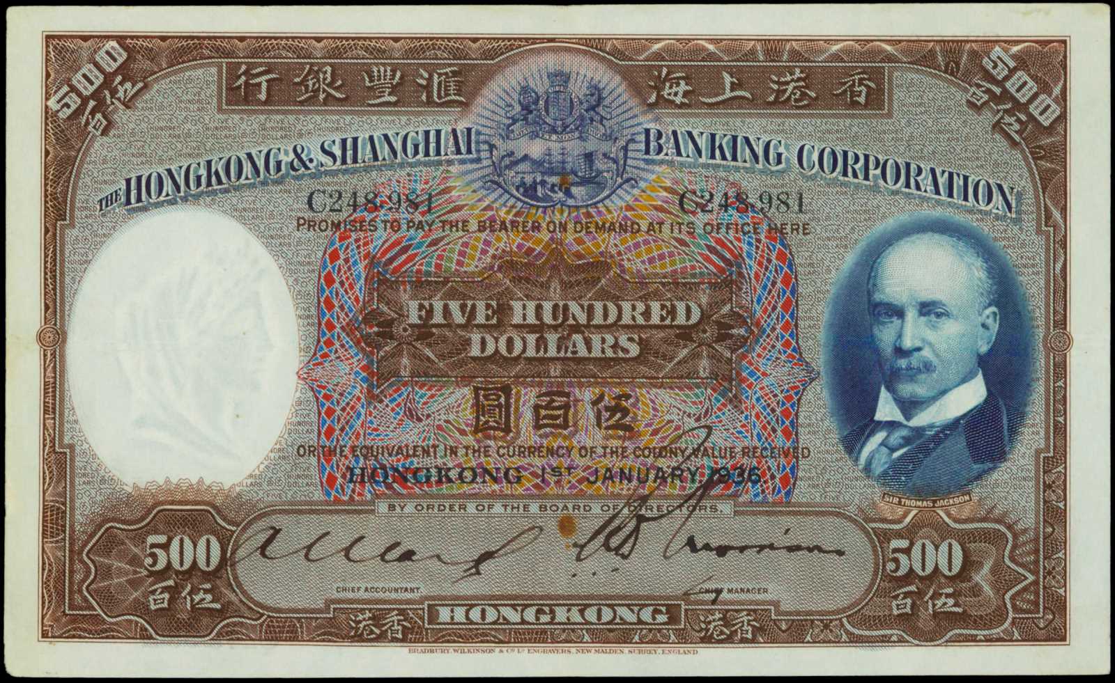 HONG KONG. Hong Kong and Shanghai Banking Corporation. 500 Dollars, 1.1.1936. P-179a. | Stacks ...