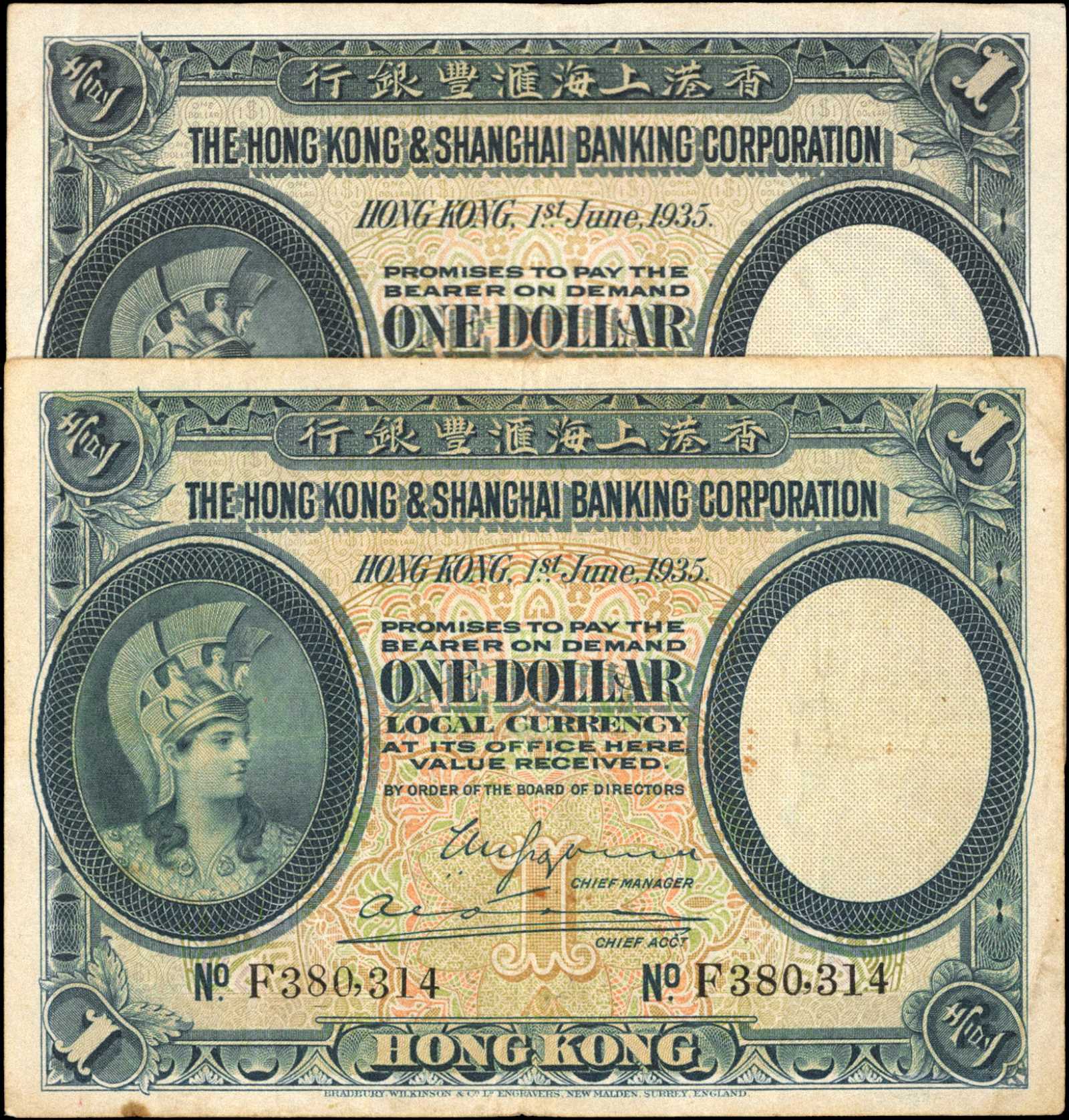 HONG KONG. Hong Kong & Shanghai Banking Corporation. Lot of (2) 1 Dollar, 1.6.1935. P-172c. Very ...