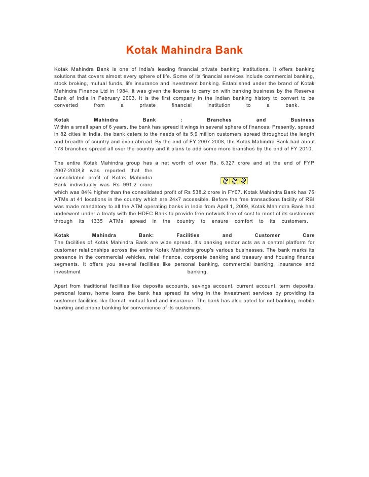It has more presence in financial services that cater to the day-to-day requirements of the customers. Get Kotak Mahindra Bank Ltd. detailed news, announcements, financial report, company information, annual report, balance sheet, profit & loss account, results and more. Experts & Broker view on Kotak Mahindra Bank Ltd. buy sell tips.